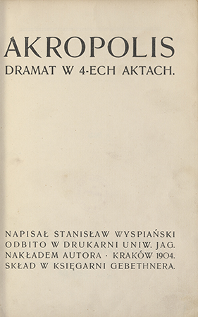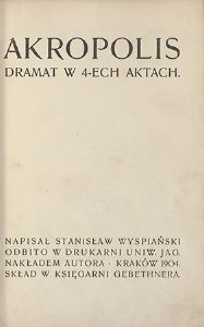 Akropolis : dramat w 4-ech aktach / Stanisław Wyspiański. - Kraków : Nakładem Autora, 1904. - 160 s., [5] k.(w tym złoż.) : il., nuty ; 21 cm.