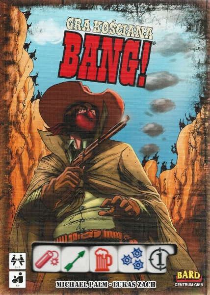 Bang! : gra kościana / [Michael Palm, Lukas Zach ; tłumaczenie Piotr Maliszewski]. - Kraków : Bard Centrum Gier, © 2013. - 1 gra (5 kostek BANG!, 30 kart (8 kart rół, 16 postaci, 6 kart pomocy), 9 żetonów strzał, 40 żetonów kul) : karton, plastik, tektura, kolor ; w pudełku 19x14x3 cm + instrukcja ([1] karta złożona).
